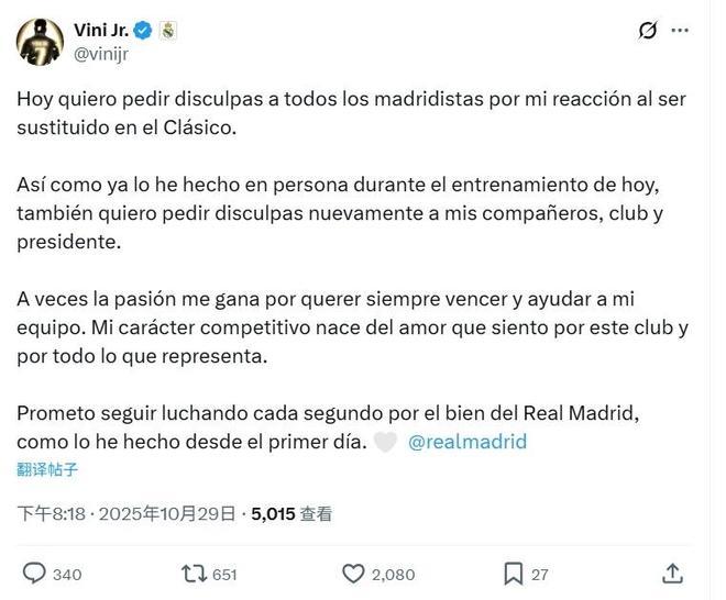 维尼修斯社媒写道:“我想就我在国家德比中被换下时的反应,向所有马德里球迷道歉。正如我今天在训练中亲自所做的那样,我也想再次向我的队友、俱乐部和主席道歉。”