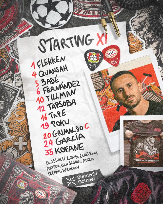 勒沃库森vs埃因霍温首发:格里马尔多领衔,佩里西奇在列